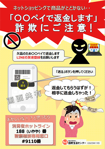 インターネット通販で購入した商品代金等の返金の際に、LINEの友達登録や画面共有するよう促されたり、「○○ペイで返金します」と連絡が来たりした場合は、相手の指示には従わず、最寄りの消費生活センターに相談してください。